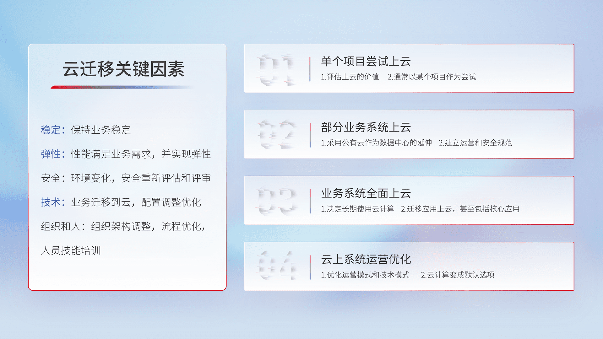 结合实际业务,,从规划设计、、、云平台选型、、、、云原生改造、、、数据迁移、、、、集成交付,,,,迁移全过程为客户识别最佳上云路径,,,做好风险识别管理,,,,设计网络架构、、、身份权限、、安全审计合规、、、、操作审计、、、、日志审计、、、、监控告警策略、、、多站点容灾设计等,,,对云上基础设施进行整体规划,,,,提升IT治理水平,,,,以满足弹性、、、、高可用、、、高性能的需求。。。。