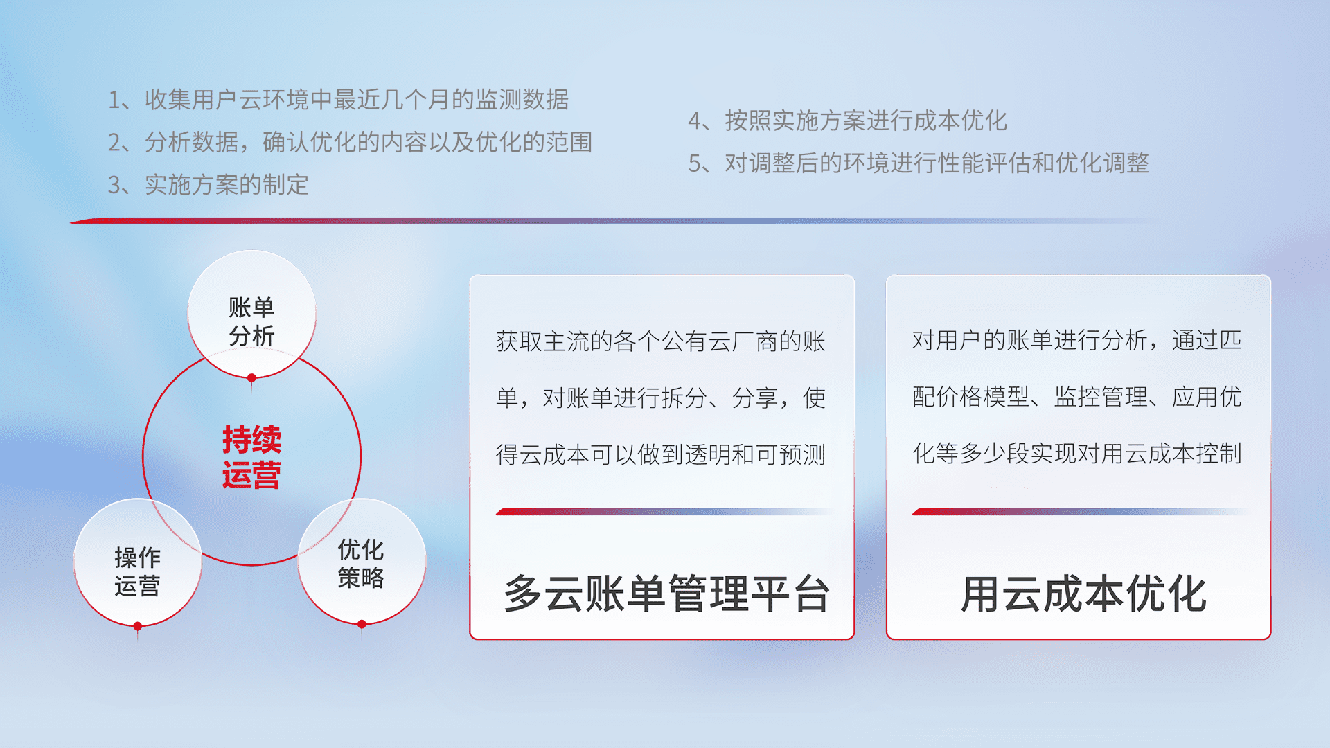 通过多云纳管,,,,以统一的资源数据模型把客户的云资源进行抽象和封装,,,进而实现对多云资源的统一操作,,保障云资源管理的可靠性、、、稳定性与可用性。。。。量身定制化运维内容,,,,配置、、开发运维、、补丁管理、、备份、、、、监控、、、、认证和访问管理、、、、审计和日常巡检等,,,,保障在用云过程中的可靠度,,,稳定度以及高可用率。。。