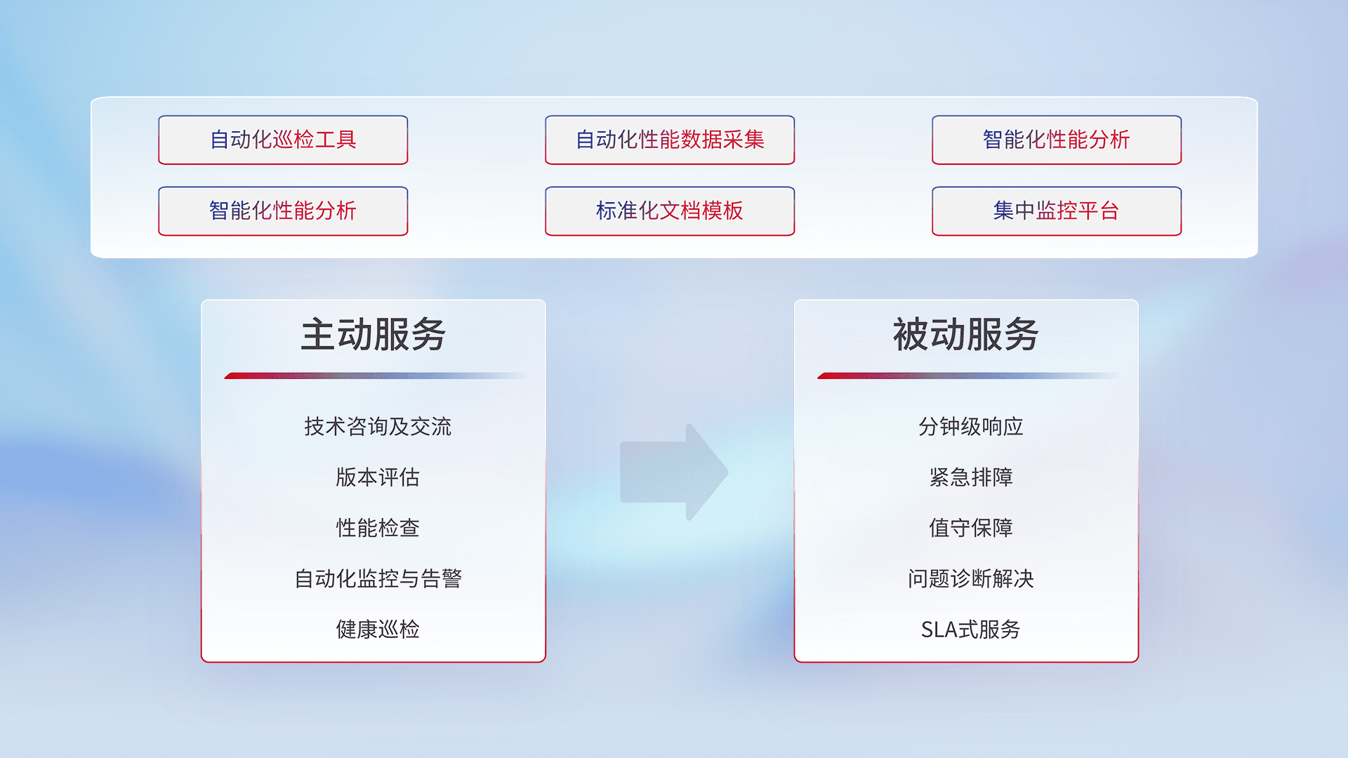 智能化工具和标准化文档,,保障服务质量,,提供主动服务(包含技术咨询、、、版本评估、、性能检查、、、、自动化监控与告警、、健康巡检)和被动服务包含(分钟级响应、、、紧急排障、、值守保障、、问题诊断解决、、、SLA服务)。。